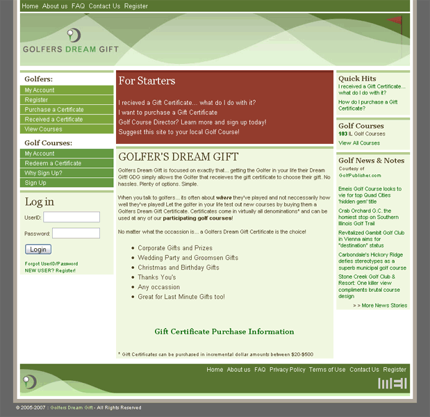 Description: Designed layout and built site using XHTML and CSS. CMS handled by MEI. Site sells gift certificates to participating golf courses.