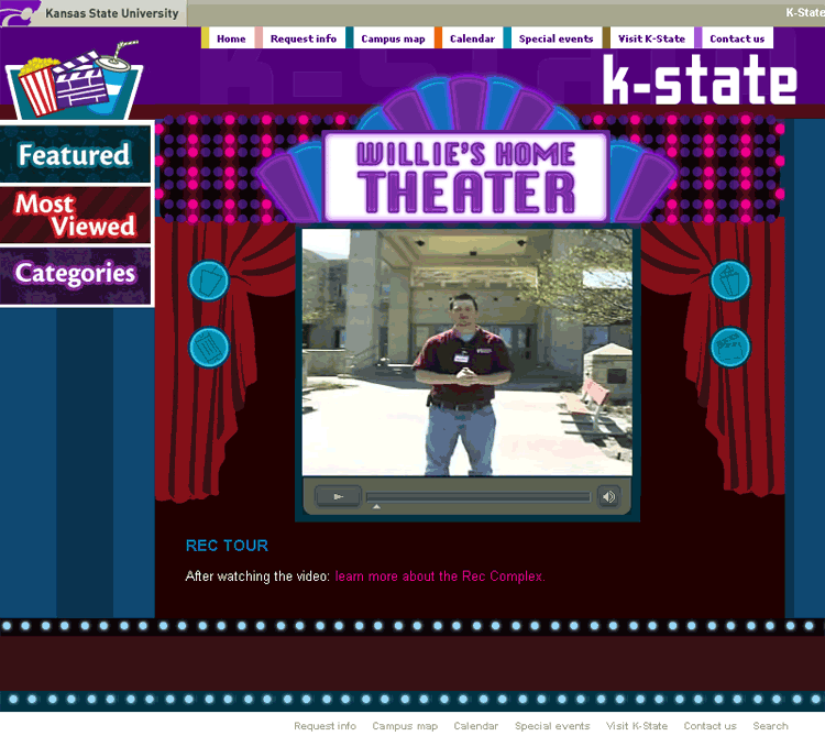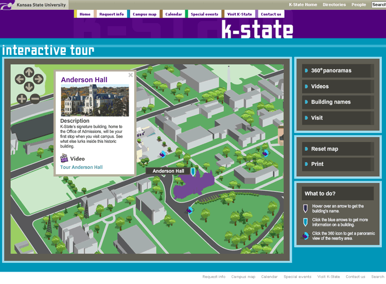 Description: Designed layout and built application in Flash for an in-depth look at the K-State campus. Includes 360 degree panoramas and also video tours.