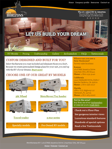 Description: Designed layout and built website using XHTML, CSS, Flash, and Javascript. CMS built on Textpattern and the content is maintained by the client. New Horizons sells custom made RV's. Site gives information on the RV's and company.