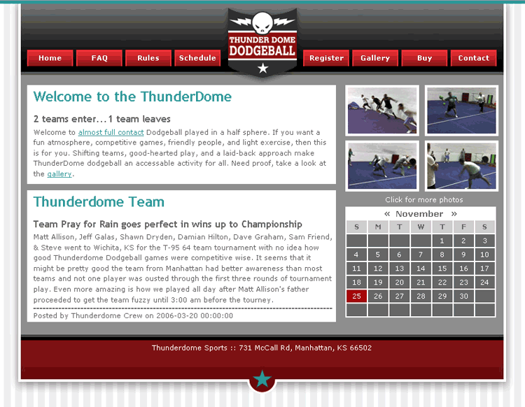 Description: Designed layout and built using XHTML, CSS, and Javascript. CMS handled by MEI. Site contains information, rules, faq's, and photos about a local dodgeball club.