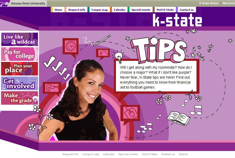 Description: Designed layout and built with XHTML, CSS, and Flash. Updated with Contribute. Site contains fun, creative, and informative tips for future students.