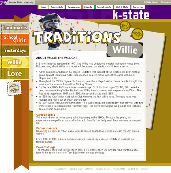 Description: Co-designed layout and built using XHTML and CSS. Updated with Contribute. Site contains information on various K-State traditions.